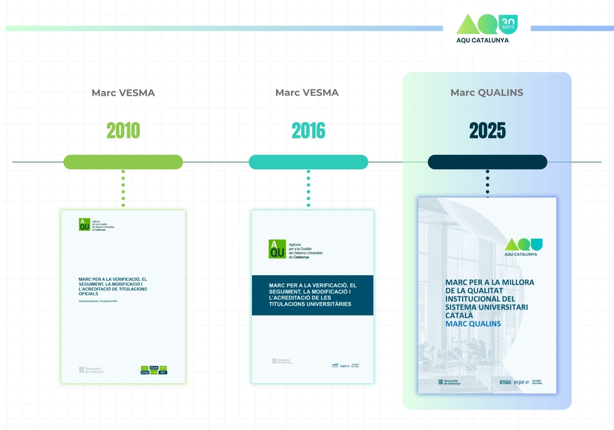 El primer marc que es va aprovar va ser el Marc VSMA, l’any 2010. L’objectiu essencial era vincular d’una manera lògica els quatre processos d’avaluació que la normativa vigent aleshores marcava per a les titulacions oficials —verificació, seguiment, modificació i acreditació— a fi d'establir una coherència conceptual i una eficiència més elevades en la gestió dels diferents processos avaluadors. Es dibuixava així el camí de la millora contínua de les titulacions. Aquell primer document emmarcava el radi d’acció de les guies i dels documents metodològics que van arribar a continuació.