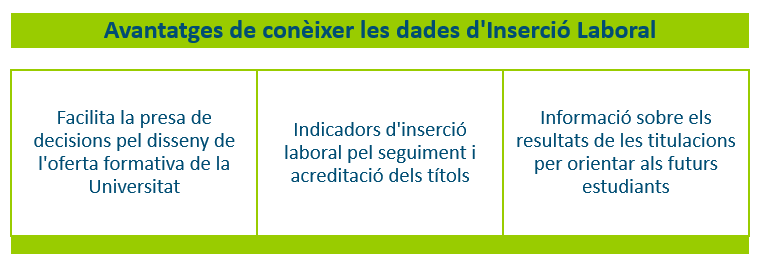 Tenir indicadors de la inserció laboral dels graduats és imprescindible per superar els processos de seguiment i acreditació de els titulacions oficials, així com pel disseny de l’oferta formativa de la universitat. També, és important poder mostrar indicadors sobre els resultats de les titulacions als estudiants i futurs estudiants perquè puguin decidir amb tota la informació disponible.