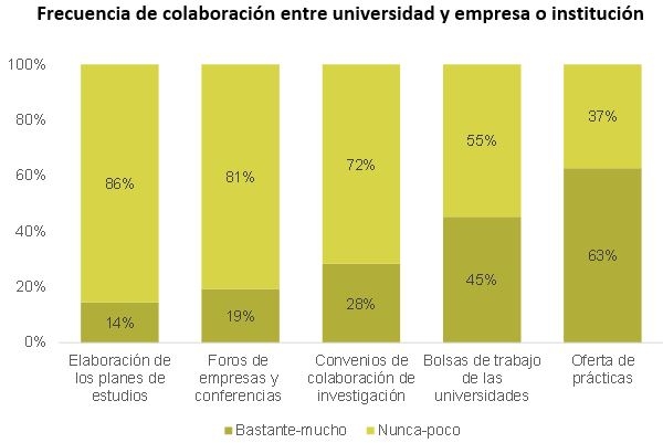 - Más del 60% de las empresas e instituciones colaboran de manera frecuente con las universidades a través de la oferta de prácticas para los estudiantes de grado.